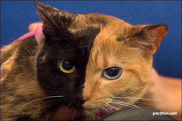 یک نگاه به صورت این گربه نشان دهنده علت شهرت آن است. این گربه یک طرف صورتش کاملا سیاه بوده با چشم سبز و طرف دیگر نارنجی با چشم آبی است. متخصصان اعتقاد دارند که این تنوع رنگی ممکن است در اثر یک نوع ترکیب ژنتیکی به وجود آمده باشد.